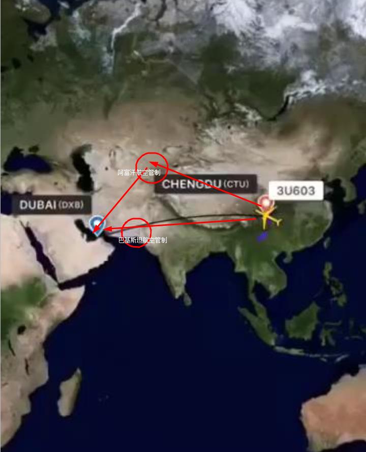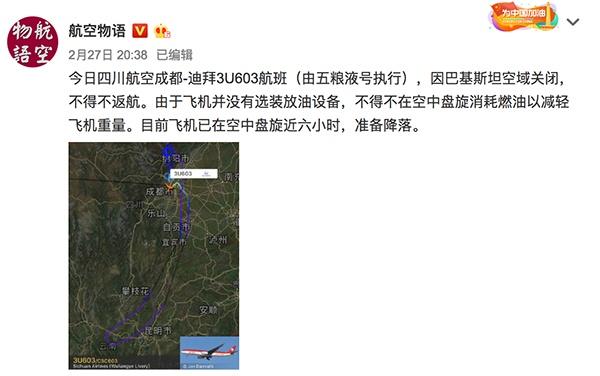 因?yàn)橛“途謩?shì)緊張,巴基斯坦關(guān)閉了領(lǐng)空,影響到了需要飛越巴基斯坦領(lǐng)空從成都到迪拜的四川航空3U603航班。